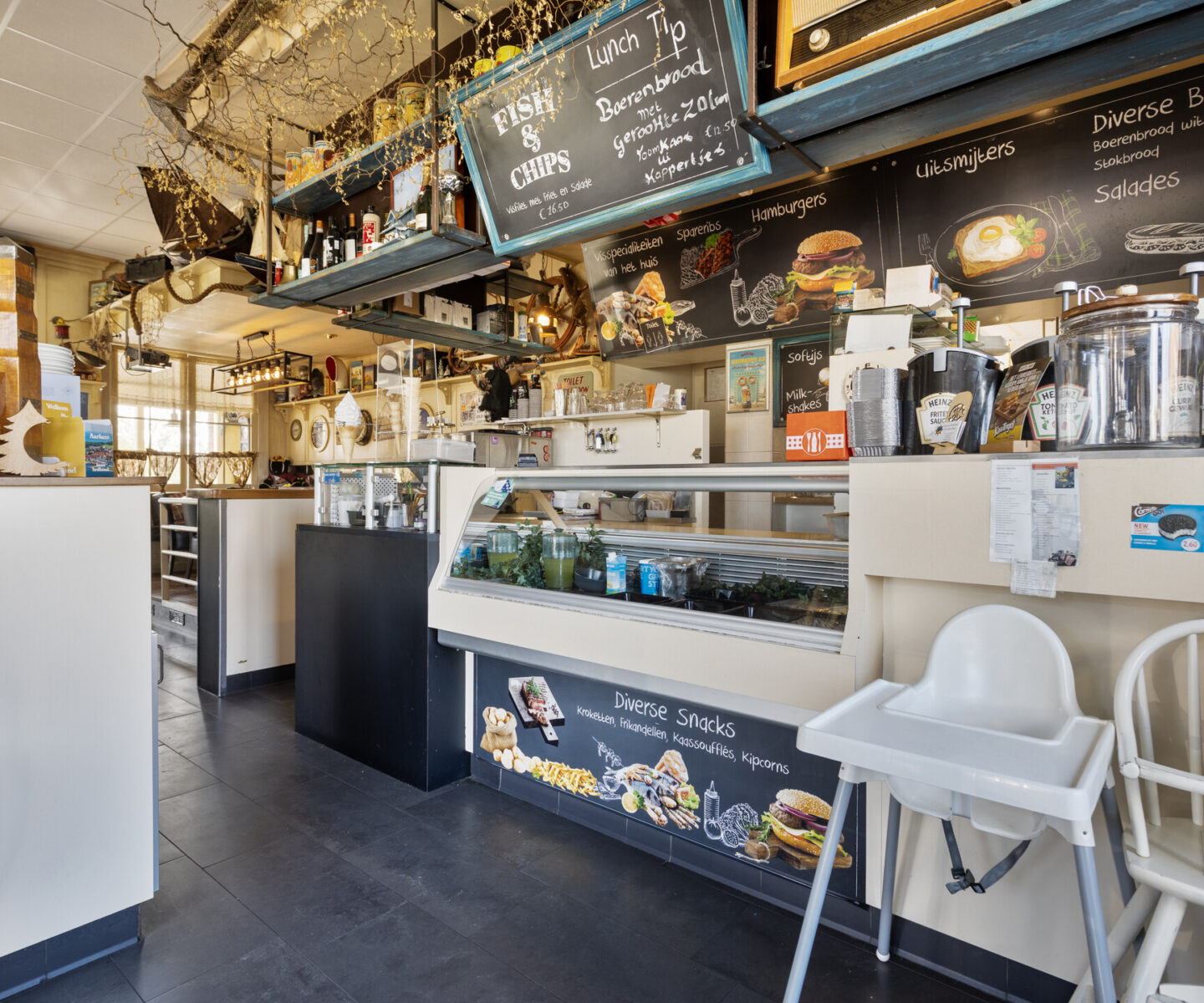 De naam De Verkeerde Wereld verwijst naar een moerasgebied dat vroeger op Marken lag, precies op de plek waar dit pand (gebouwd in 2007) nu gevestigd is. Dit karaktervolle horecabedrijf, dat fungeert als cafetaria/petit-restaurant, biedt een uitgebreide menukaart vol verse, ambachtelijke gerechten. Zoals het (voormalig) vissersdorp betaamt, is de vis hier van uitzonderlijke kwaliteit. Met vers gesneden friet, huisgemaakte soepen en een breed aanbod aan gerechten en snacks, is er voor ieder wat wils. Daarnaast kunnen gasten genieten van een selectie dranken, waaronder verfrissende bieren en een goed glas wijn.