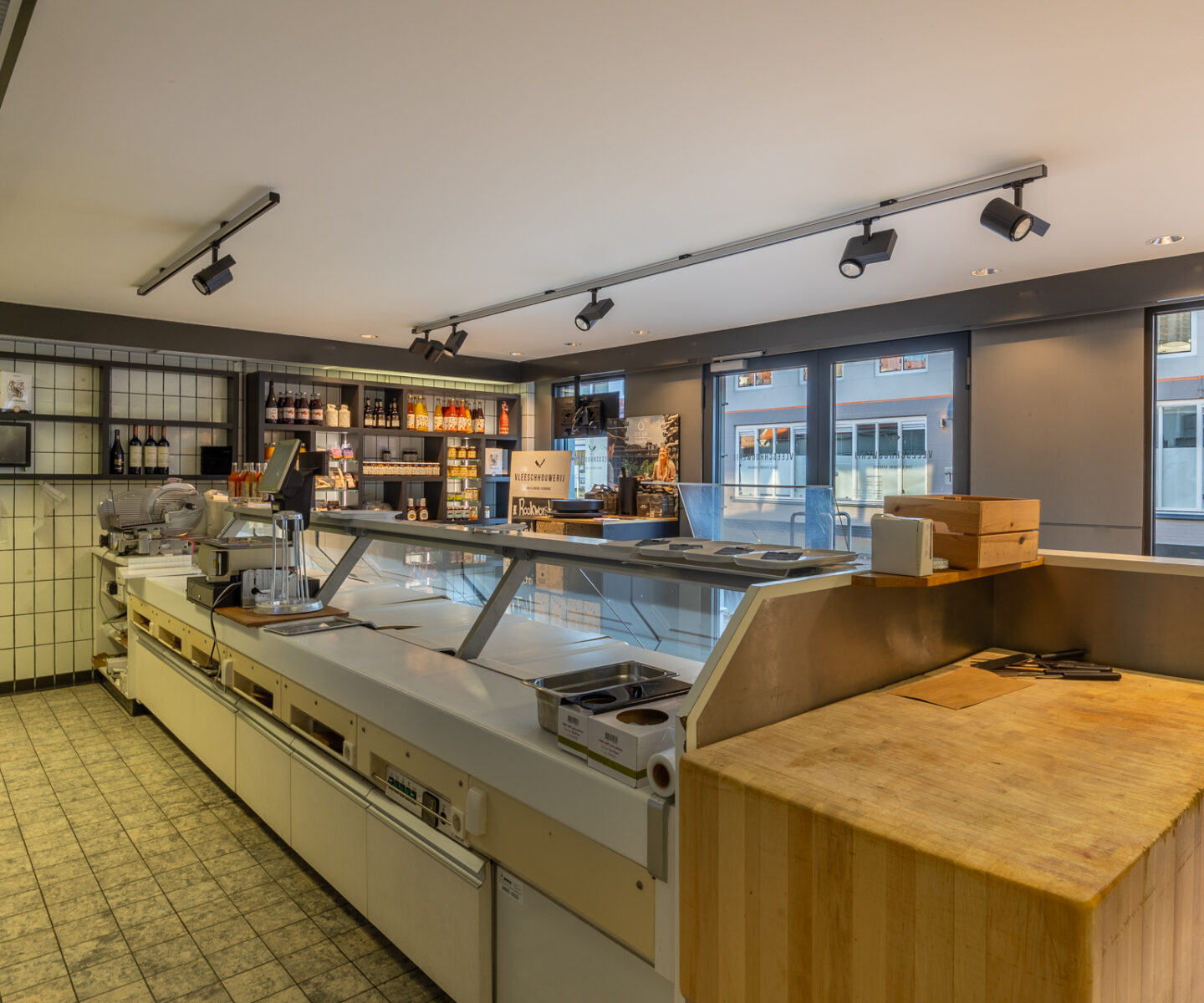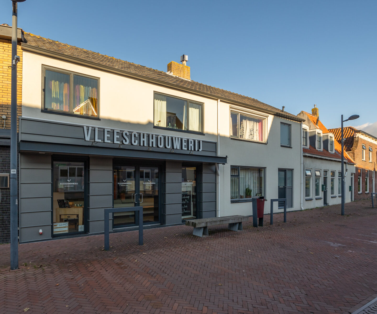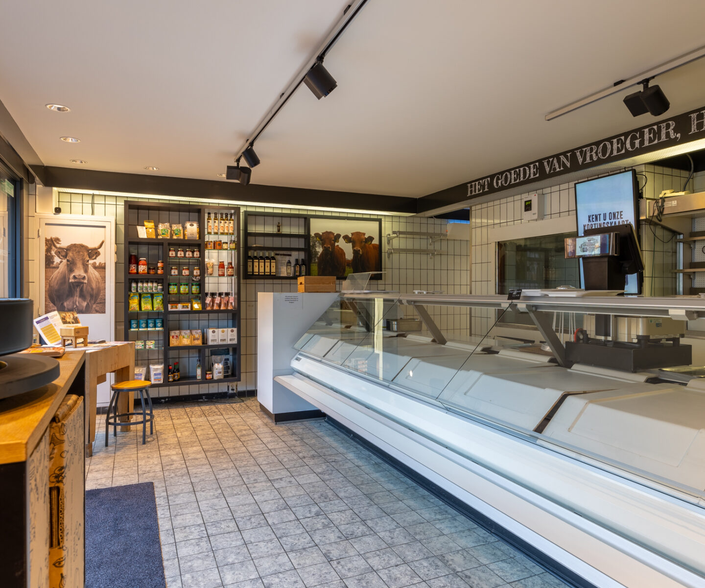 De winkel-/bedrijfsruimte betreft het voormalige pand van Slagerij ‘Vleeschouwerij’, waarvan de exploitatie is beëindigd. Het object omvat een totaal vloeroppervlak van circa 205 m², verdeeld over twee bouwlagen. De begane grond beschikt over circa 125 m² VVO en is ingedeeld met een winkelruimte aan de voorzijde, een doorloop naar de keuken, koelcel en verwerkingsruimte.