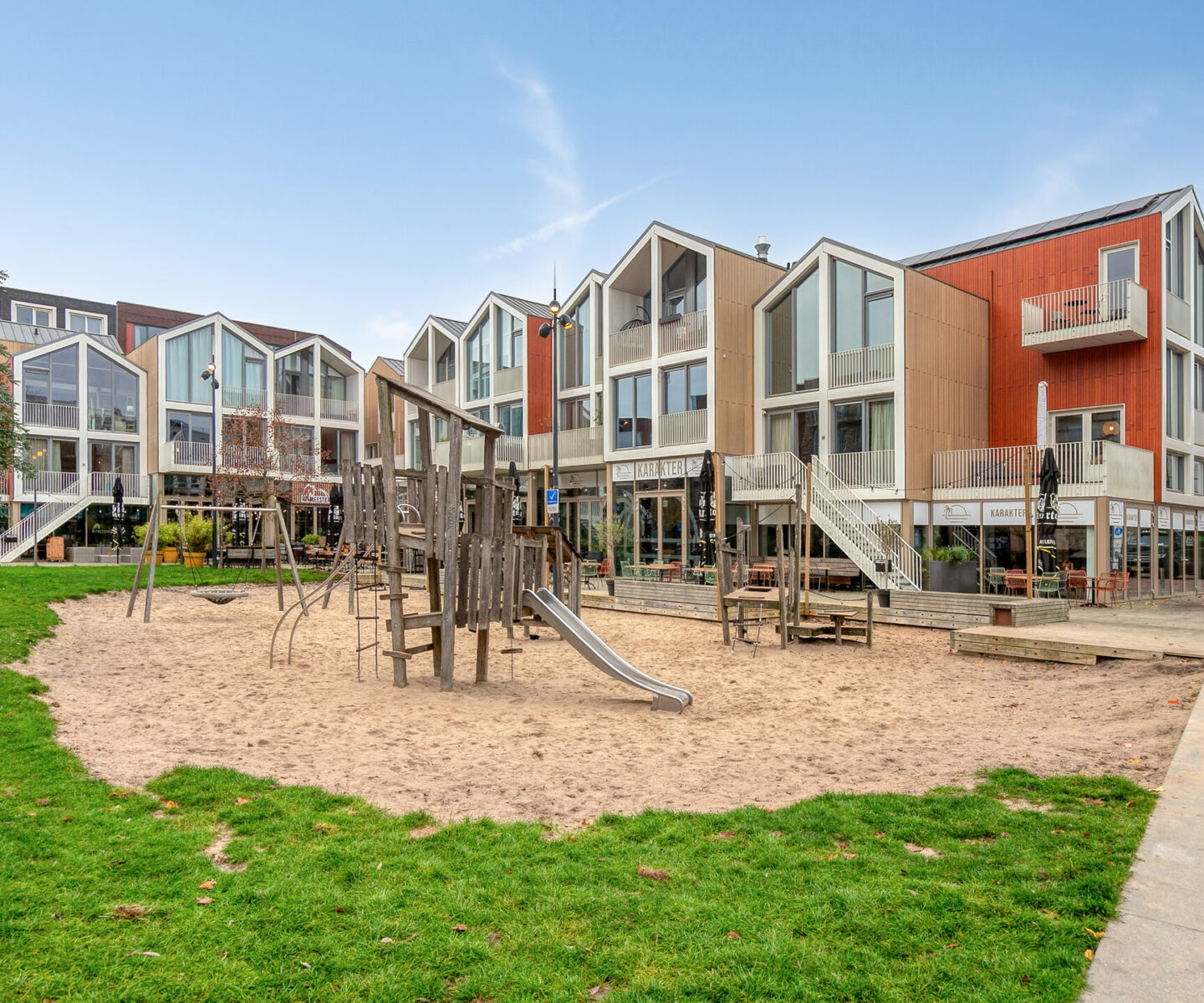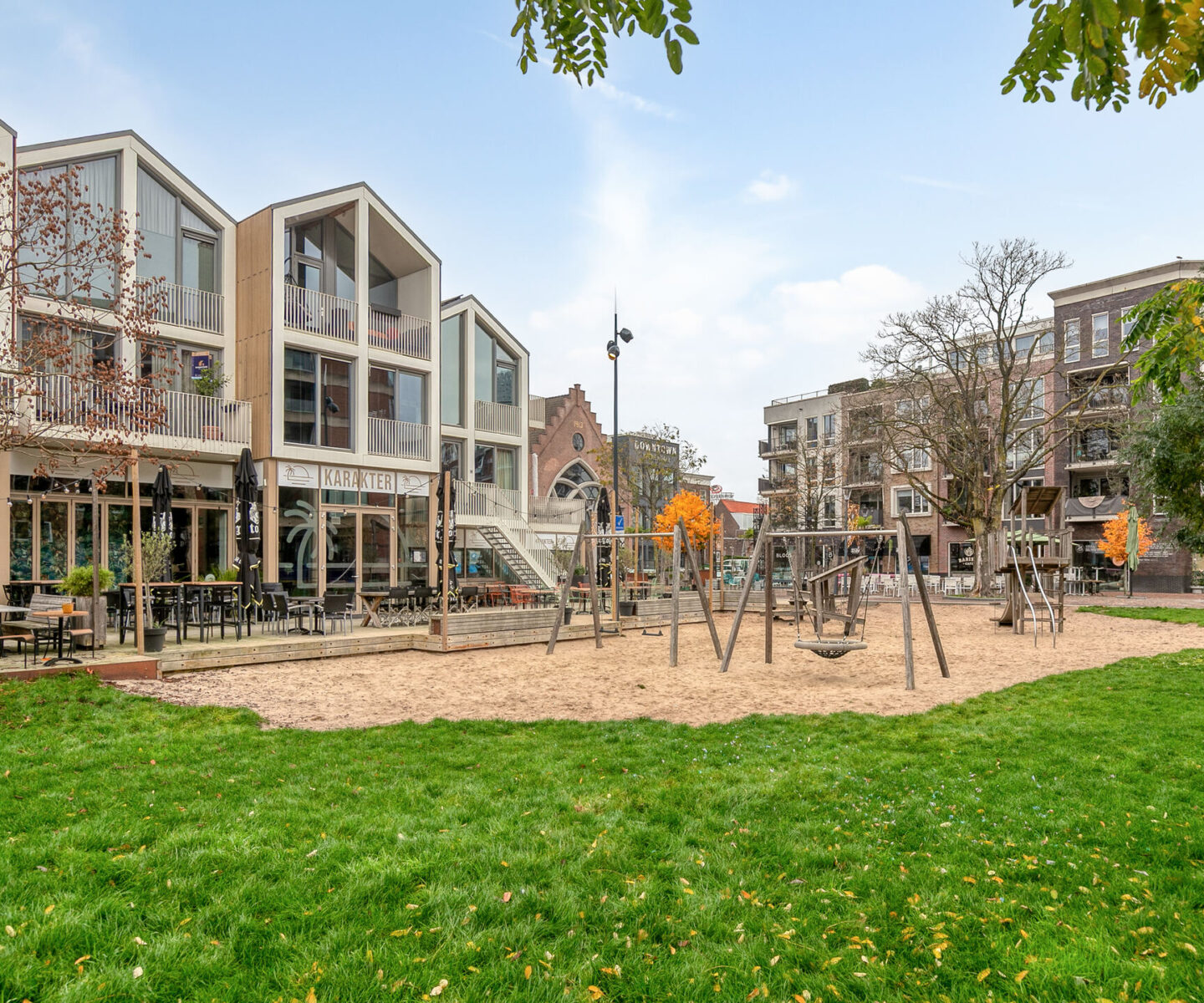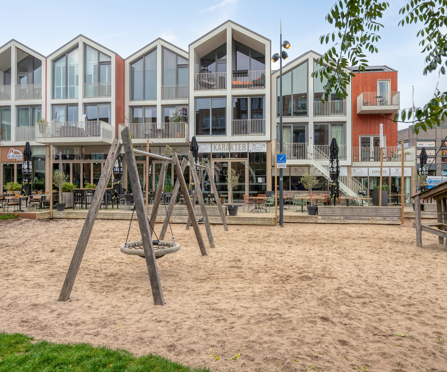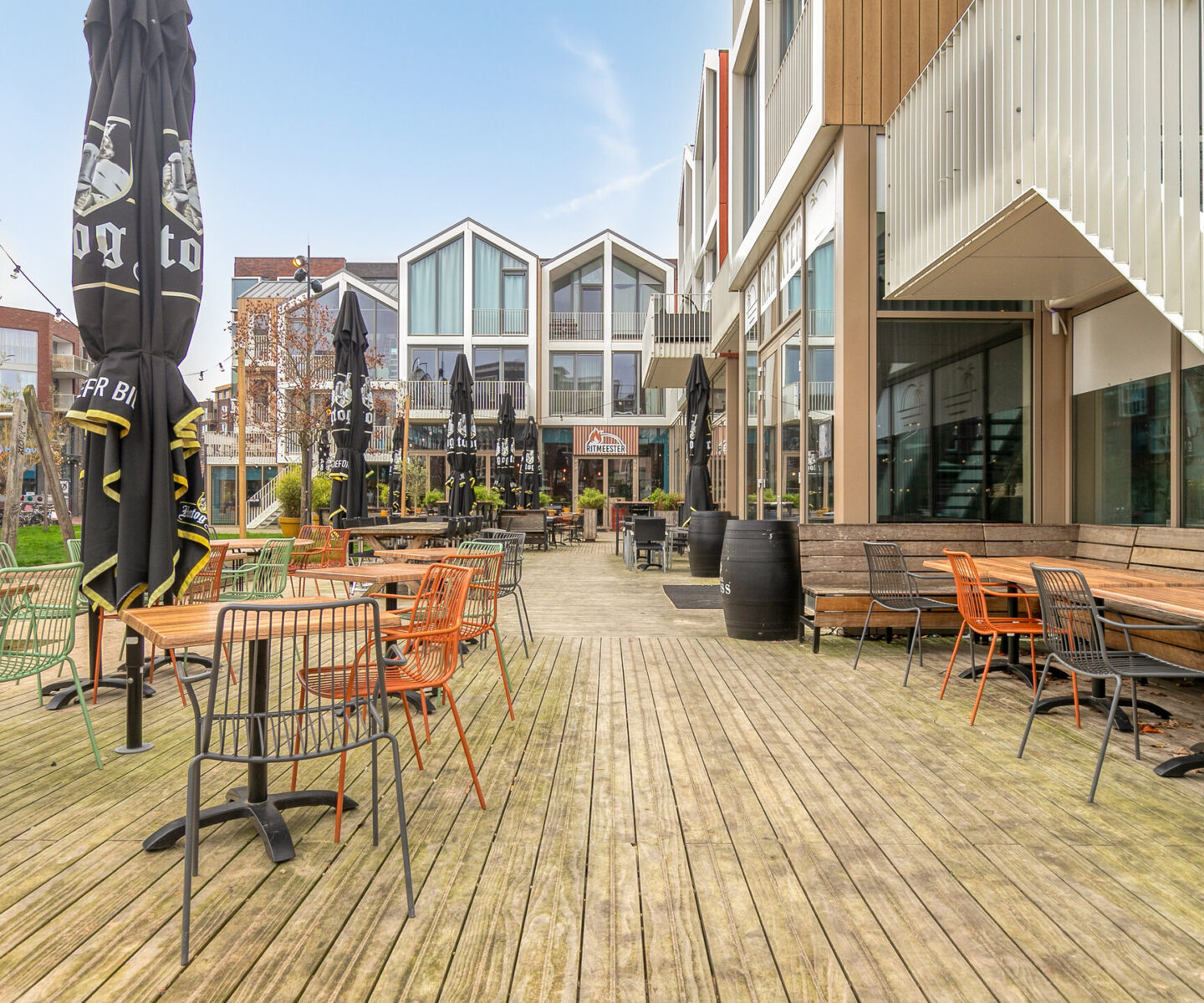 Het terras bevindt zich op een ruim houten vlonder aan het plein, met zicht op de speeltuin en de omliggende nieuwbouw. Dankzij de ligging profiteert het terras vrijwel de gehele dag van zon en een constante aanloop.